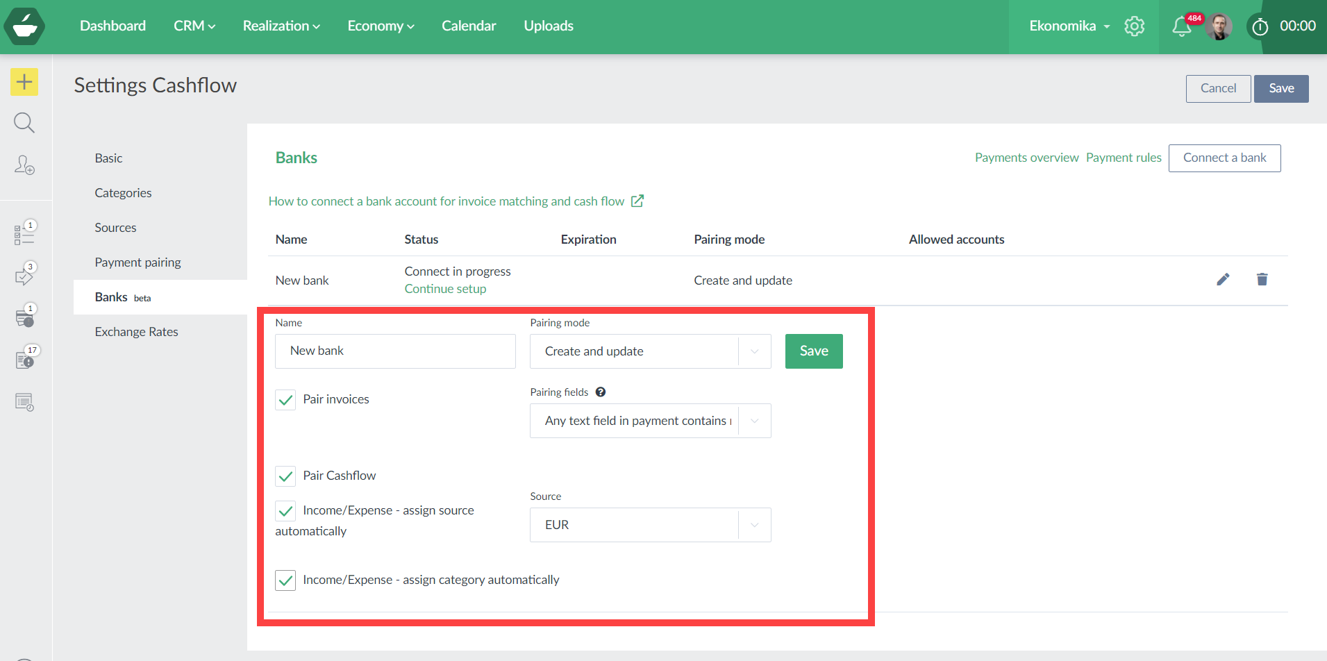 - Pair cashflow - when this option is selected, the system is trying to pair bank payments with income and expenses