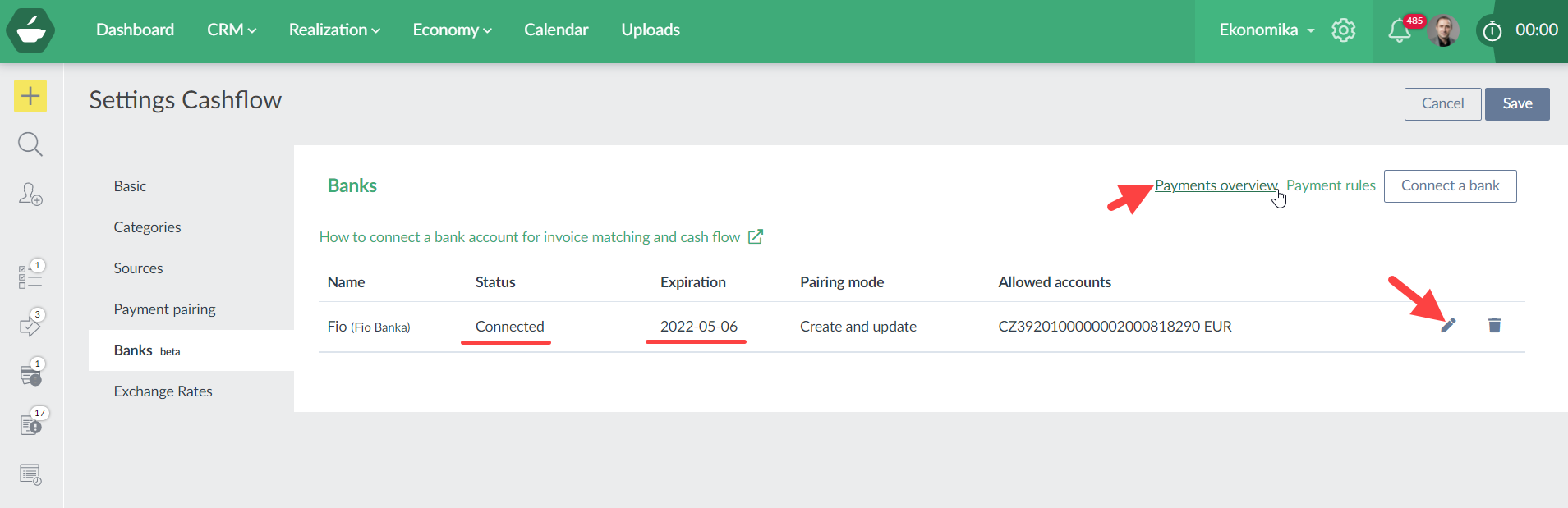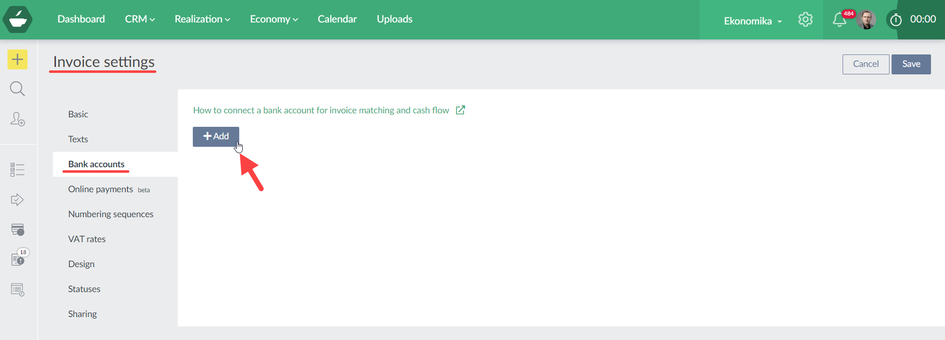 - If you are NOT working with invoices in Caflou, but you are working with Cashflow, set up the bank connection from the Cashflow settings.