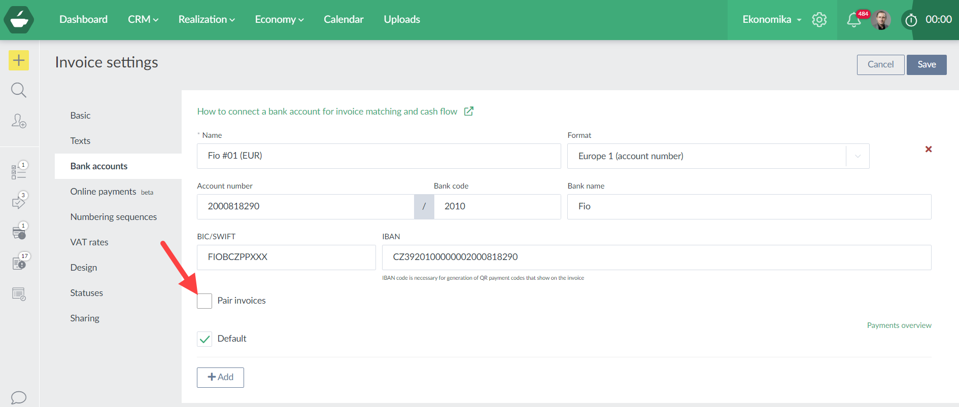 - If you are working with invoices in Caflou, and not Cashflow, set up the bank connection from the Invoice settings.