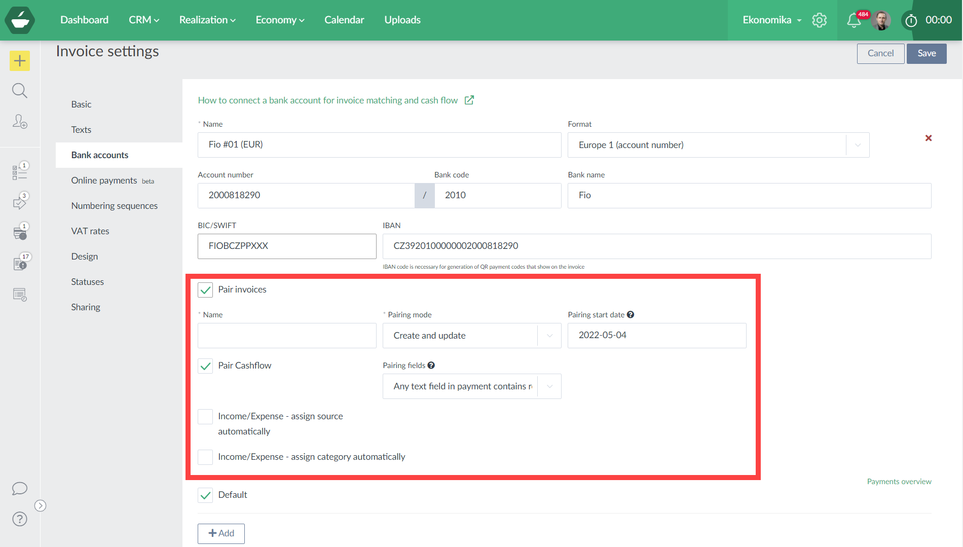 - *Pair cashflow - when this option is selected, the system is trying to pair bank payments with income and expenses