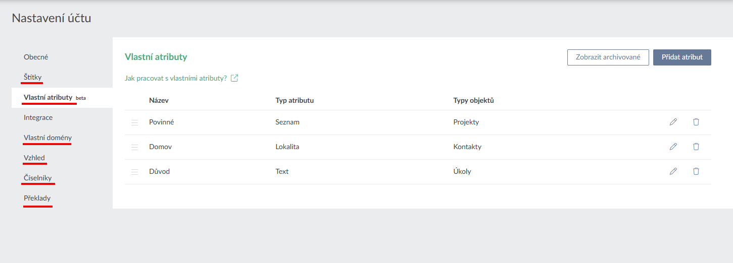 - překlady - možnost přejmenovat si přednastavené názvy "Firmy" a "Projekty" (např. na Zákazníci a Zakázky)