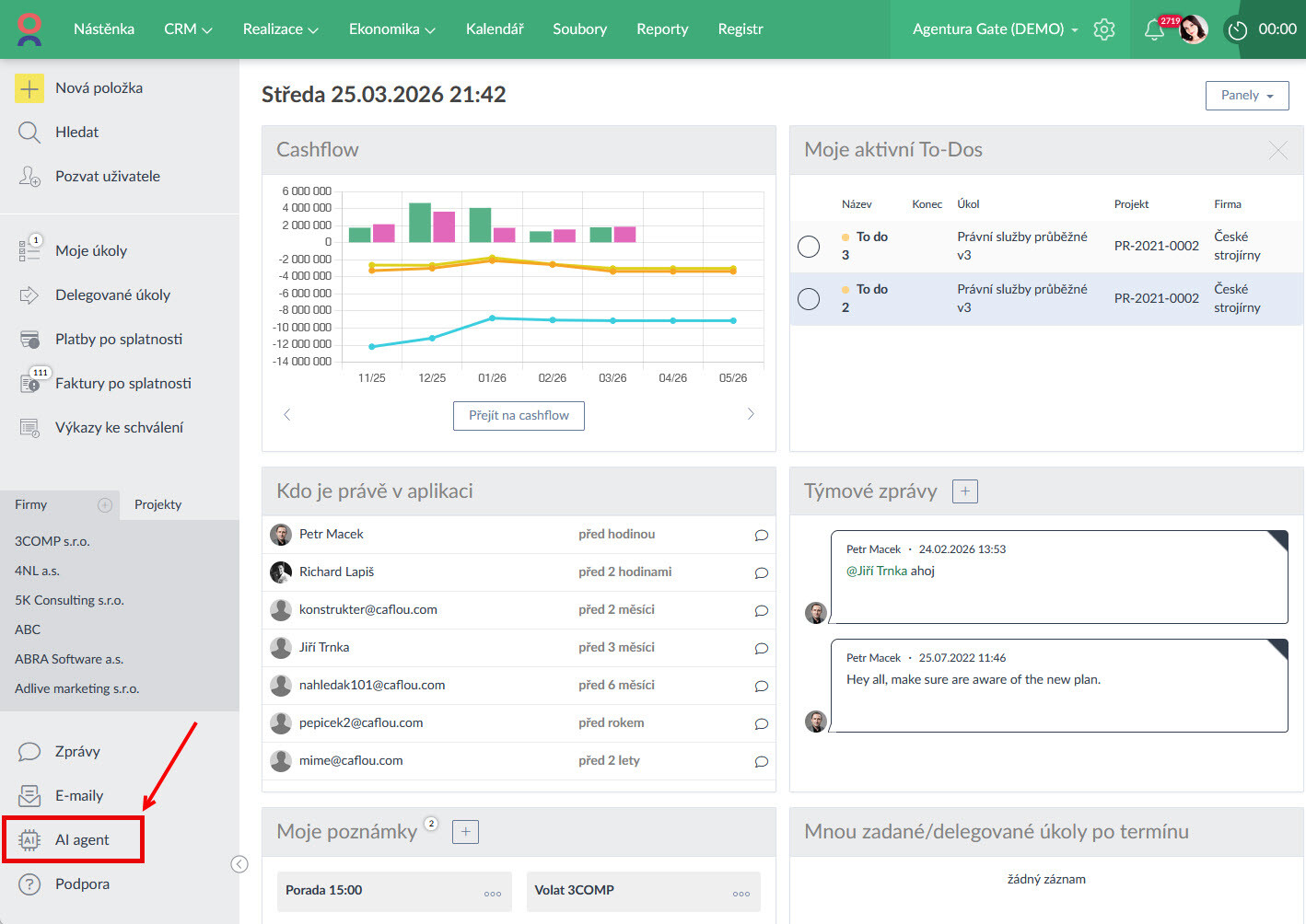 - Při aktivování AI agenta tuto funkčnost získá každy uživatel v účtu. Ovšem data, ke kterým má skrze AI agenta přístup, jsou omezeny právy. Uživatel nevidí to, na co nemá práva. např. pokud nemá uživatel práva na konkrétní projekt, tak ho neuvidí, stejně tak nevidí např. ekonomické parametry projektu, pokud k nim nemá přístup.