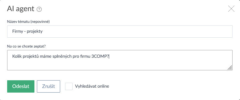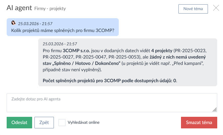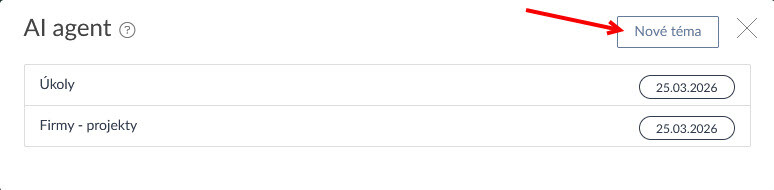 AI agent umí fungovat jako konverzační nástroj, kdy si vytvoříte nové téma a ptáte se na informace z vašeho účtu (např. Co bych měl dnes dělat? Jaké úkoly spěchají? Kdo kolik odpracoval hodin za minulý týden?), systém jednotlivá témata ukládá a na konverzaci lze dále navazovat.