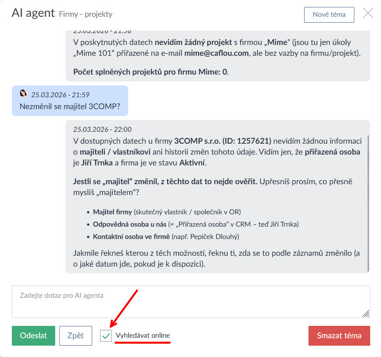 Kromě vyhledávání informací v Caflou lze umožnit AI agentovi vyhledávat i online, např. pokud chcete online zjistit doplňující informace nebo pokud to agentovi prospěje při řešení zadání.